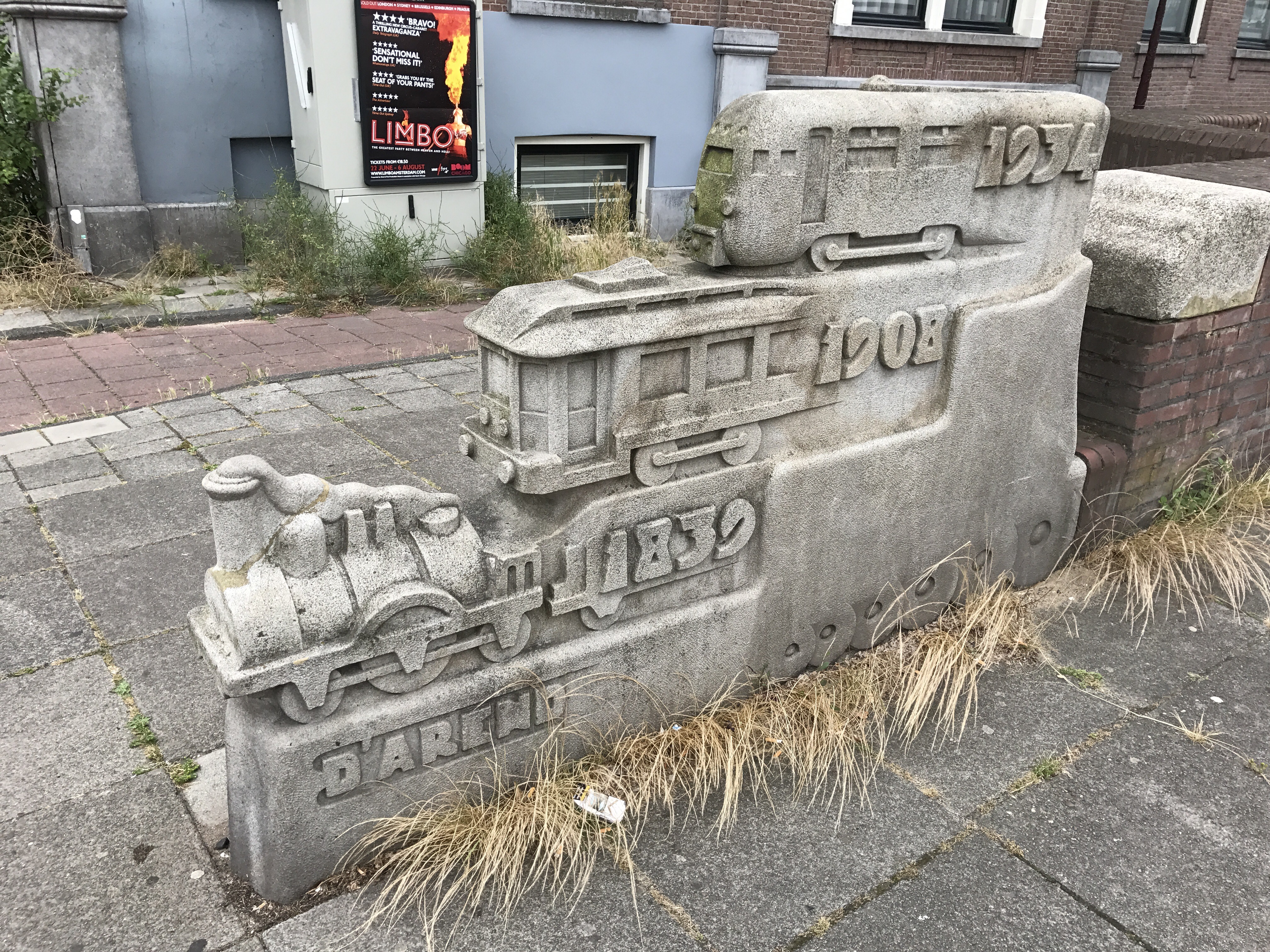 Metrostation Weesperplein, Rhijnspoorplein Amsterdam. Vroeger het eindpunt van het Rhijnspoor, de trein naar Utrecht en Arnhem. Maar ook het eindpunt van de tram uit Het Gooi. Een schitterend monumentje van Hildo Krop herinnert nog aan het Weesperpoortstation. De drukte van de treinen is nu verstopt, onder de grond.